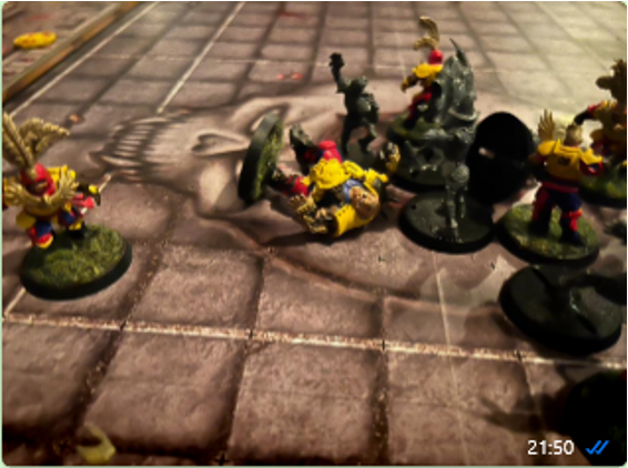 The Werewolf carrier (whistler) gets knocked down by thrower, but Andru the Ogre rolls double skulls and falls over ‘d’oh!!’
